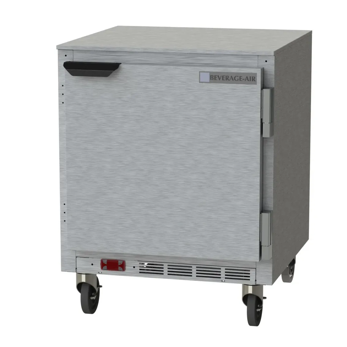 Realize kitchen dreams with the Beverage Air UCF27HC Undercounter Freezer. This one-section freezer is designed to meet the needs of commercial restaurants, offering a shallow depth and a spacious 5.25 cu. ft. capacity. The solid hinged door provides easy access to the two shelves, allowing for efficient organization and storage of frozen goods. The stainless steel top with turned down edges not only adds a sleek and professional look to your kitchen, but also ensures durability and easy cleaning. With a stainless steel exterior and an aluminum interior, this freezer is built to withstand the demands of a busy restaurant environment. The rear-mounted self-contained refrigeration system, powered by a 1/4 HP compressor, ensures consistent and efficient cooling. Plus, with the use of R290 Hydrocarbon refrigerant, this freezer is environmentally friendly. Trust in the quality and reliability of Beverage Air, a trusted name in commercial refrigeration.