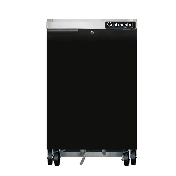 Unleash gastronomic brilliance with the Continental Refrigerator BB24N Back Bar Cabinet. This refrigerated unit is designed to meet the demands of a commercial restaurant, ensuring that your ingredients and beverages are kept at the perfect temperature. With its stainless steel top and lockable door, this back bar cooler not only provides a sleek and secure storage solution but also adds a touch of sophistication to your establishment. The electronic controller with a digital display and hi-low alarm allows for precise temperature control and monitoring, giving you peace of mind. The black enamel finish exterior and galvanized interior with a reinforced stainless steel floor make this unit durable and easy to clean. The epoxy coated steel shelves provide ample storage space for your bottles and cans. With its rear-mounted self-contained refrigeration and 5" locking casters, this back bar cabinet is both efficient and mobile. Trust in the Continental Refrigerator BB24N to elevate your restaurant's beverage service to new heights.