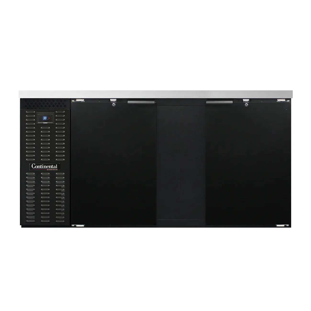 Cooking at its finest begins with the Continental Refrigerator BB69N Back Bar Cabinet. This refrigerated unit is designed to meet the needs of commercial restaurants, offering a spacious 26.0 cu. ft. capacity to store all your beverages and ingredients. The front breathing feature allows for easy installation, while the stainless steel top provides durability and a sleek appearance. With two doors that come with locks, you can ensure the security of your valuable items. The electronic controller with a digital display and hi-low alarm allows for precise temperature control and monitoring. The black enamel finish exterior adds a touch of elegance to any restaurant setting, while the galvanized interior with a reinforced stainless steel floor ensures longevity. The epoxy coated steel shelves provide ample storage space and are easy to clean. Made in the USA and certified by cETLus and NSF, this Continental Refrigerator Back Bar Cabinet is a reliable and high-quality addition to any commercial kitchen.