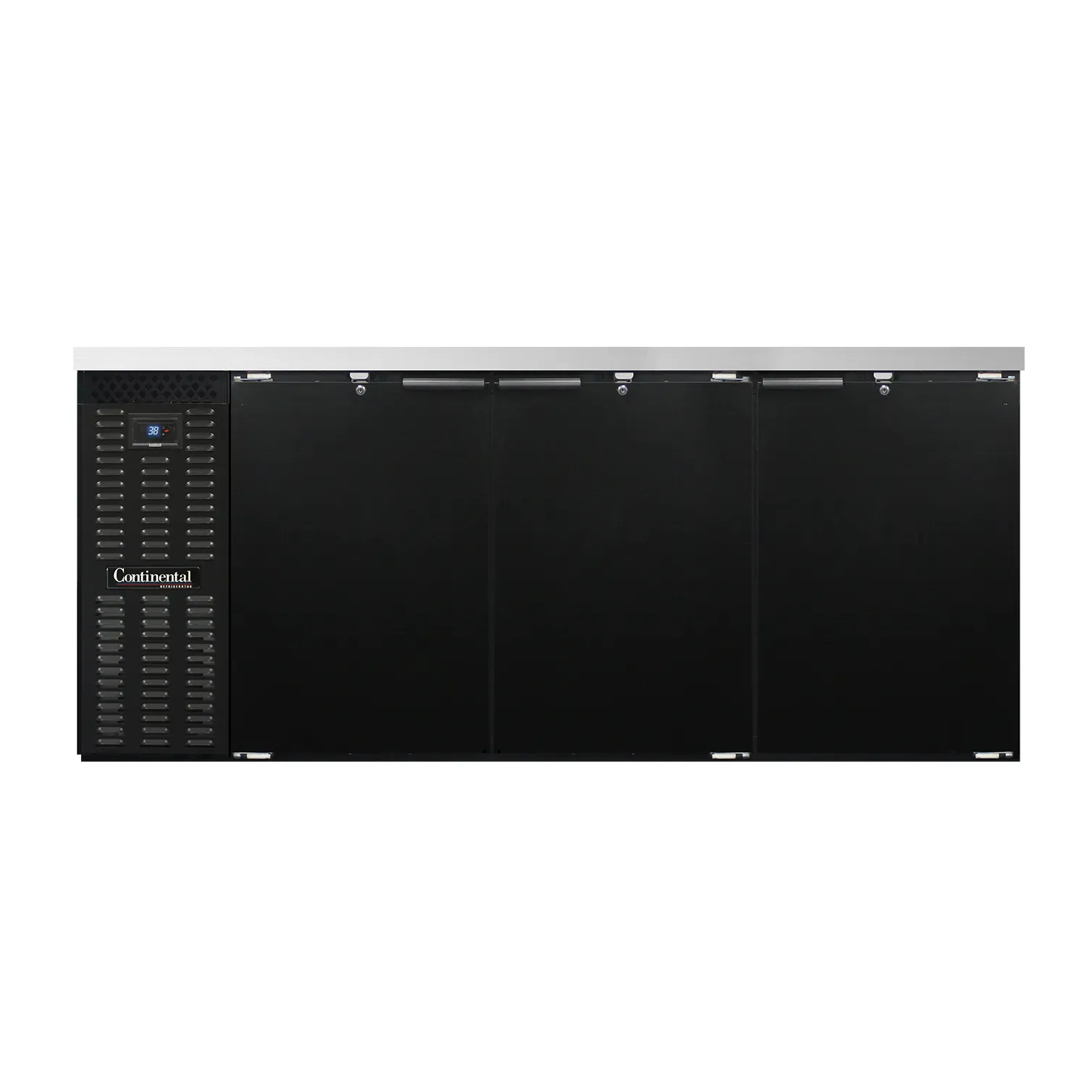 Master the art of cooking with the Continental Refrigerator BB79SN Back Bar Cabinet. This refrigerated unit is designed specifically for commercial restaurant use, offering a shallow depth and a spacious 79" width to accommodate all your storage needs. With a capacity of 22.0 cu. ft., this back bar cooler provides ample space for keeping your beverages and ingredients chilled and easily accessible. The three doors come with locks for added security, while the electronic controller with a digital display and hi-low alarm ensures precise temperature control and monitoring. The black enamel finish exterior and galvanized interior with a reinforced stainless steel floor not only make this cabinet durable but also easy to clean. The epoxy coated steel shelves provide sturdy support for your items. Made in the USA and certified by cETLus and NSF, the Continental Refrigerator BB79SN is a reliable and high-quality addition to any commercial kitchen.