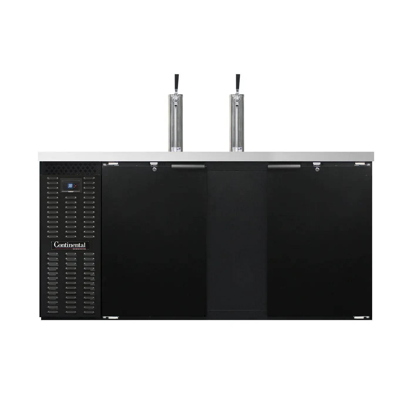 Realize kitchen dreams with the Continental Refrigerator KC69N Draft Beer Cooler. This top-of-the-line keg cooler is designed to meet the needs of commercial restaurants, offering a spacious 26.0 cu. ft. capacity that can hold up to three barrels or straight wall kegs. The stainless steel top features two columns and a drainer, providing a convenient workspace for bartenders. With two lockable doors, you can ensure the security of your kegs and other supplies. The electronic controller with a digital display and hi-low alarm allows for precise temperature control and monitoring. The black enamel finish exterior adds a sleek and professional look to any establishment, while the galvanized interior with a reinforced stainless steel floor ensures durability and easy cleaning. Made in the USA and certified by cETLus and NSF, this Continental Refrigerator Draft Beer Cooler is the perfect addition to any commercial kitchen.