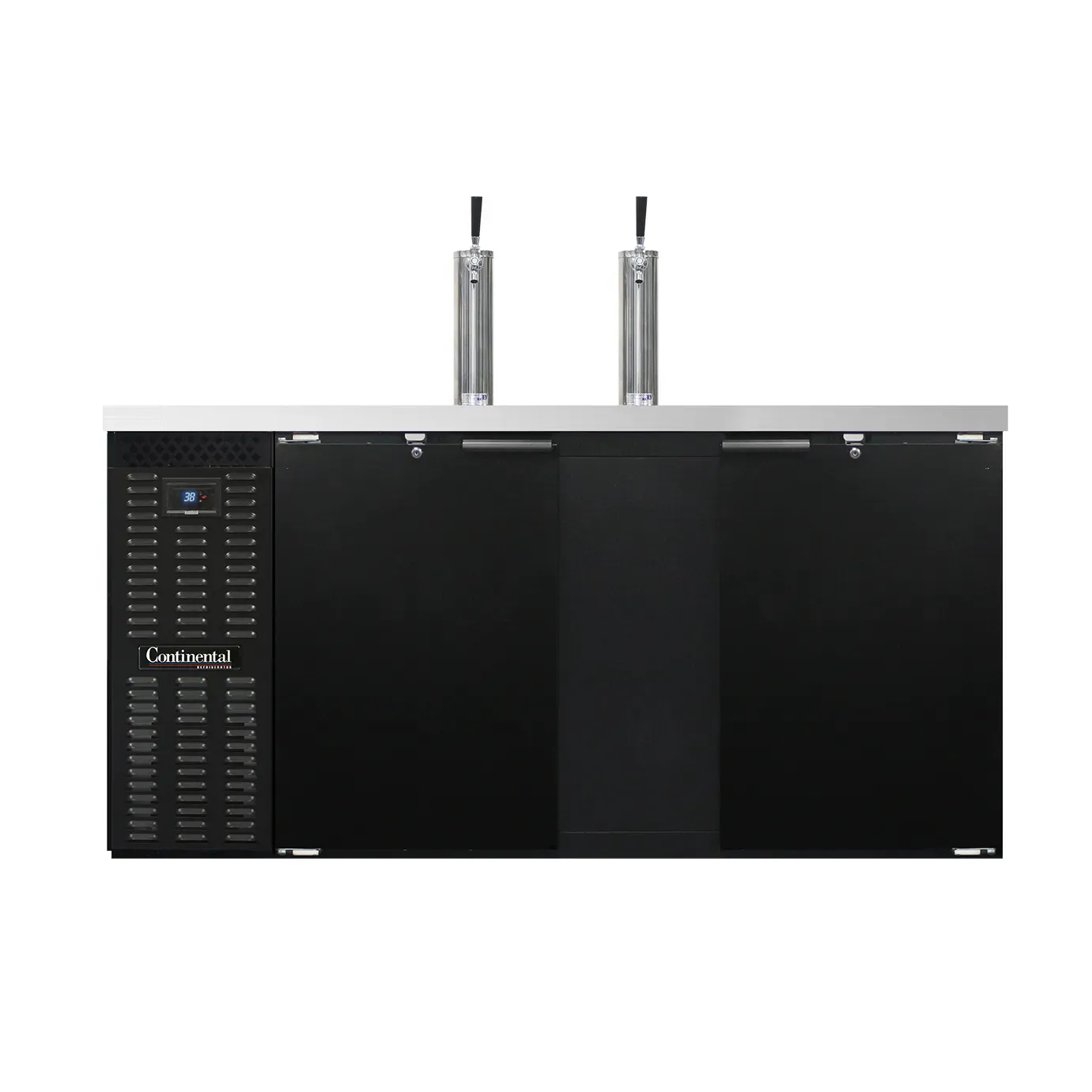 Revolutionize your cooking setup with the Continental Refrigerator KC69SN Draft Beer Cooler. This top-of-the-line keg cooler is designed to meet the demands of a busy commercial restaurant. With a capacity of 18.0 cu. ft., it can hold up to three barrels or straight wall kegs, ensuring you always have a variety of draft beers on tap for your customers to enjoy. The stainless steel top features two columns and a drainer, providing a sleek and functional workspace. The electronic controller with a digital display and hi-low alarm allows for precise temperature control and ensures your beer is always served at the perfect temperature. The black enamel finish exterior not only adds a touch of elegance to your establishment but also makes the cooler easy to clean and maintain. Made in the USA, this keg cooler is built to last with a reinforced stainless steel floor and self-contained refrigeration. Trust Continental Refrigerator to deliver exceptional quality and performance for your commercial kitchen.