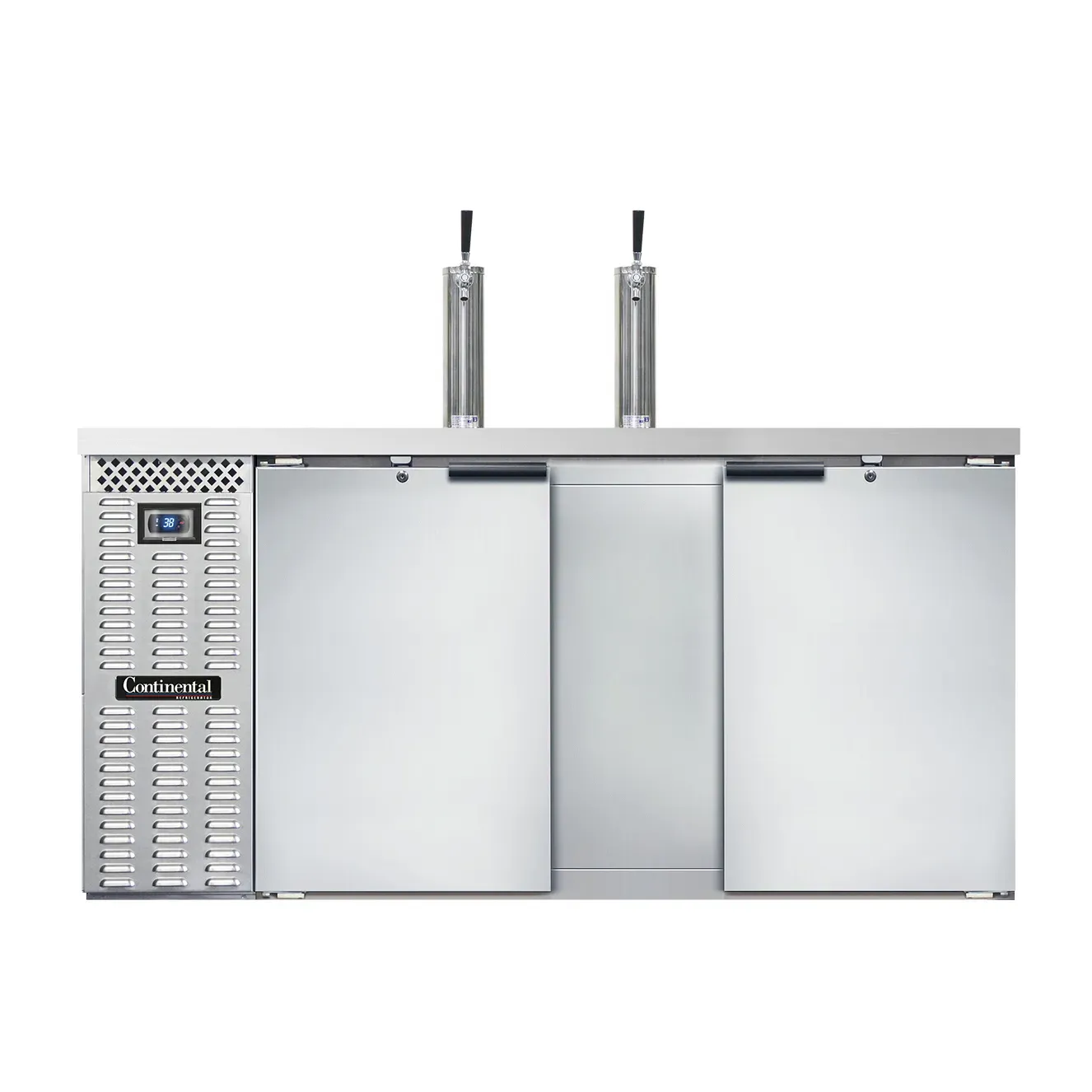 Ignite culinary passion with the Continental Refrigerator KC69SNSS Draft Beer Cooler. This top-of-the-line keg cooler is a must-have for any commercial restaurant looking to elevate their beverage offerings. With a spacious 18.0 cu. ft. capacity, this cooler can hold up to three barrels or straight wall kegs, ensuring you always have a variety of draft beers on tap for your customers to enjoy. The stainless steel top features two columns and a drainer, providing a sleek and functional workspace. The electronic controller with a digital display and hi-low alarm allows for precise temperature control and ensures your beer is always served at the perfect temperature. Made in the USA, this keg cooler is built to last with a reinforced stainless steel floor and self-contained refrigeration. With its stylish design and reliable performance, the Continental Refrigerator KC69SNSS Draft Beer Cooler is the ideal choice for any commercial restaurant looking to enhance their beverage service.