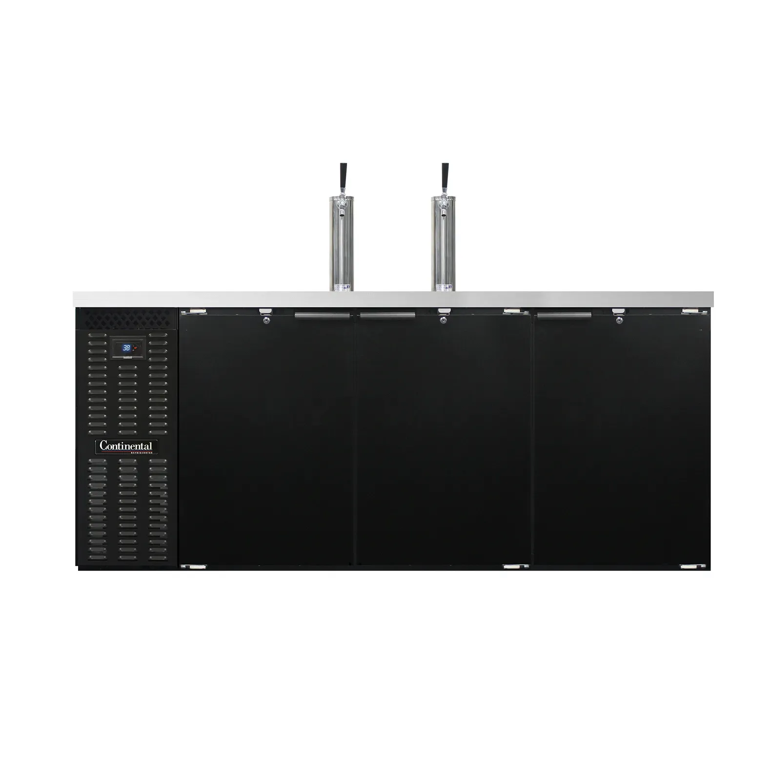 Unleash your inner chef with the Continental Refrigerator KC79N Draft Beer Cooler. This top-of-the-line keg cooler is a must-have for any commercial restaurant looking to serve draft beer in style. With a spacious 28.0 cu. ft. capacity, it can hold up to three barrels or four straight wall kegs, ensuring you never run out of your customers' favorite brews. The stainless steel top features two columns and a drainer, providing a sleek and functional workspace for your bartenders. The three doors come with locks for added security, and the electronic controller with a digital display and hi-low alarm allows for precise temperature control. Made in the USA with a black enamel finish exterior and a galvanized interior with a reinforced stainless steel floor, this keg cooler is built to last. Trust Continental Refrigerator for all your commercial refrigeration needs.