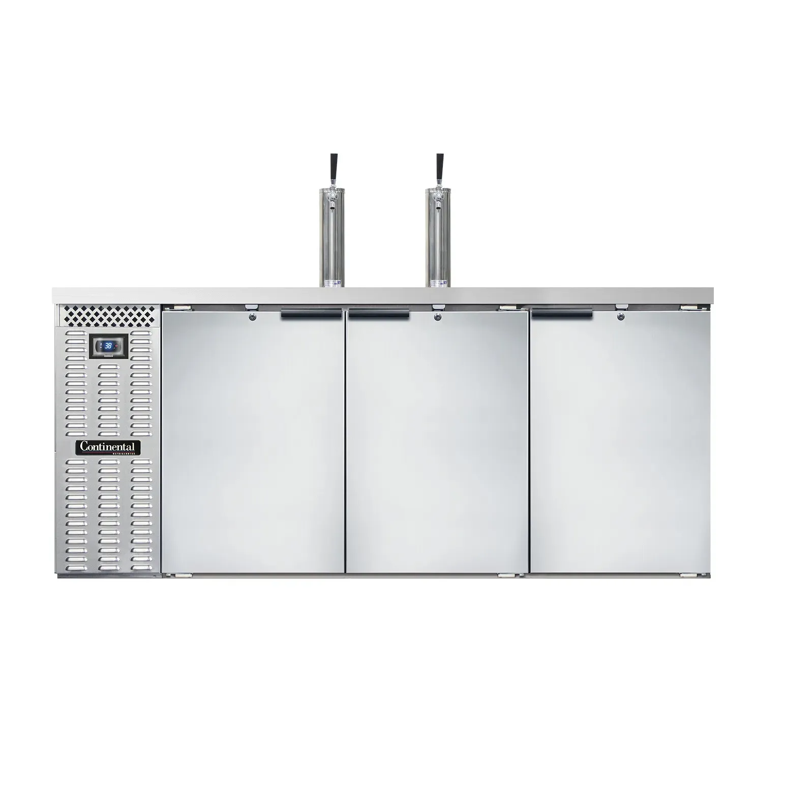 Invest in superior quality with the Continental Refrigerator KC79NSS Draft Beer Cooler. This top-of-the-line keg cooler is designed to meet the demands of a busy commercial restaurant. With a spacious 28.0 cu. ft. capacity, it can hold up to three barrels or four straight wall kegs, ensuring you always have a variety of beers on tap for your customers. The stainless steel top features two columns and a drainer, providing a convenient space for pouring and serving. The three doors are equipped with locks to keep your inventory secure. The electronic controller with a digital display and hi-low alarm allows for precise temperature control and monitoring. Made in the USA, this keg cooler is built to last with a reinforced stainless steel floor and self-contained refrigeration. Trust Continental Refrigerator for reliable, high-quality equipment that will enhance your restaurant's beverage service.