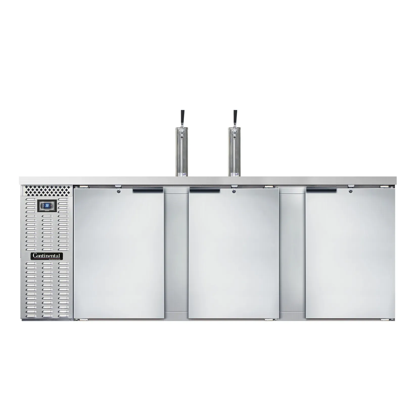 Master the art of flavor with the Continental Refrigerator KC90NSS Draft Beer Cooler. This top-of-the-line keg cooler is designed to meet the needs of commercial restaurants, ensuring that your customers always enjoy a perfectly chilled draft beer. With a spacious 35.0 cu. ft. capacity, this cooler can hold up to four barrels or five straight wall kegs, allowing you to offer a wide selection of beers to your patrons. The stainless steel top features two columns and a drainer, providing a convenient workspace for your bartenders. The three doors are equipped with locks to keep your inventory secure. The electronic controller with a digital display and hi-low alarm allows for precise temperature control and ensures that your beer is always served at the perfect temperature. Made in the USA, this keg cooler is built to last with its stainless steel exterior and reinforced stainless steel floor. Trust Continental Refrigerator to deliver exceptional quality and performance for your commercial restaurant.