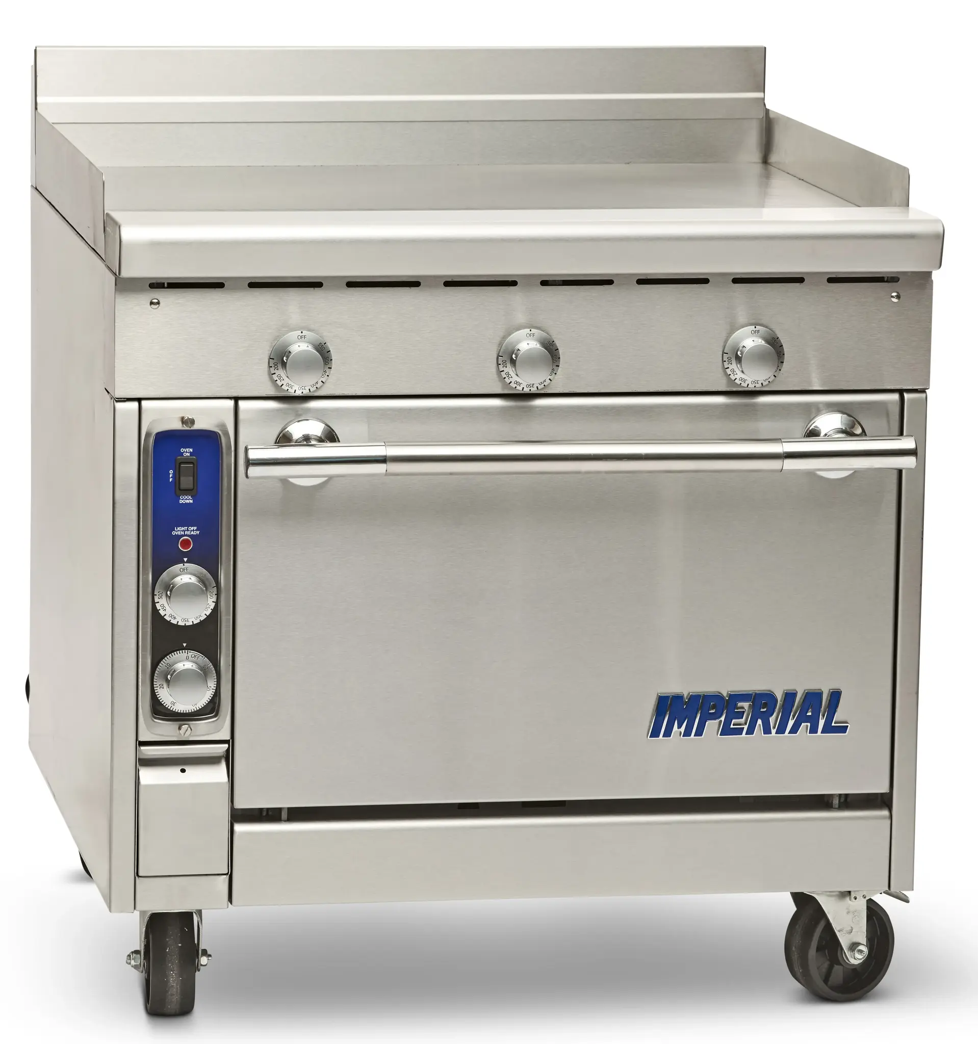 Master the art of flavor with the Imperial IHR-GT36-E Range. This heavy-duty electric range is designed to meet the demands of a commercial restaurant kitchen. With a 36" griddle and a standard oven, this range offers versatility and efficiency in cooking. The thermostatic controls allow for precise temperature adjustments, ensuring consistent and delicious results every time. The chrome rack and splatter screen provide convenience and safety during cooking. The 4"W grease trough and removable grease can make cleaning a breeze, while the porcelain oven interior ensures durability and easy maintenance. Made with a stainless steel front, sides, backguard, kick plate, and landing ledge, this range is built to withstand the rigors of a busy kitchen. The adjustable feet and 6" legs provide stability and flexibility in installation. Trust the Imperial IHR-GT36-E Range to elevate your culinary creations and deliver exceptional flavors to your customers.