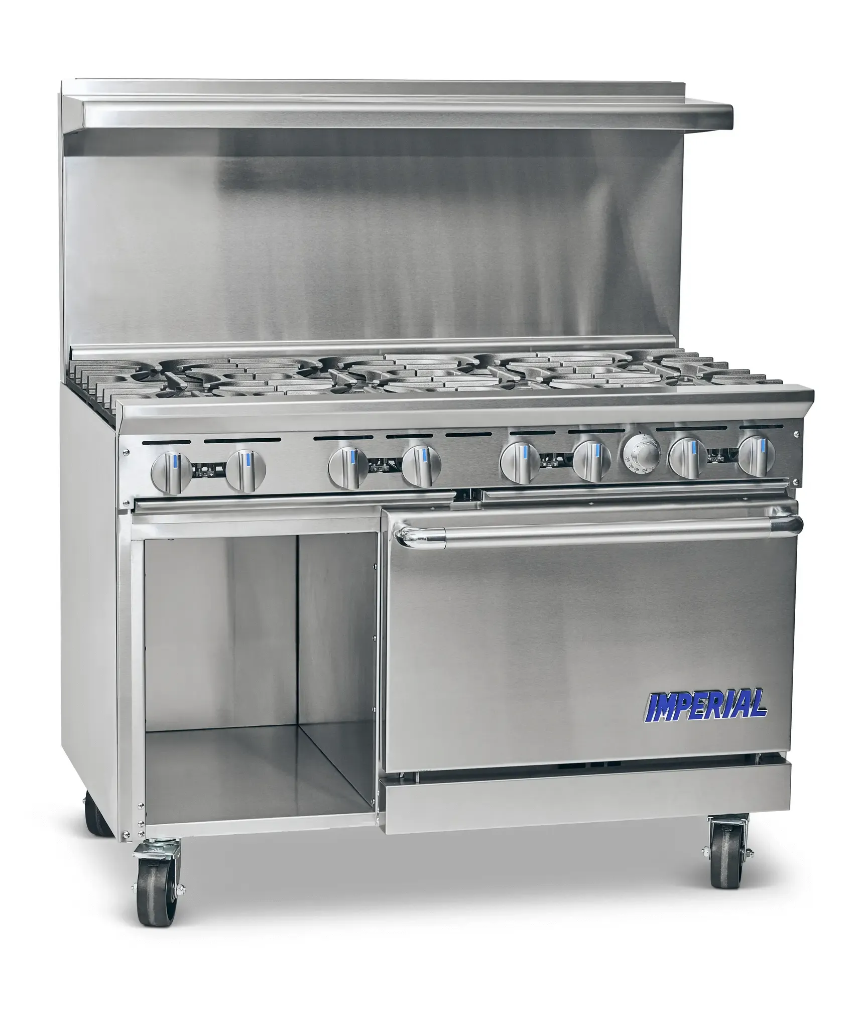 Upgrade your restaurant kitchen with the Imperial IR-G48-XB Range. This 48" gas restaurant range is designed to meet the demands of a busy commercial kitchen. It features a griddle and a standard oven, providing versatility for cooking a variety of dishes. The open cabinet with a bottom shelf offers convenient storage space for your cookware and utensils. The manual controls allow for precise temperature adjustments, ensuring consistent cooking results. The 3" grease trough, removable grease can, and crumb tray make cleaning a breeze, saving you time and effort. Made with stainless steel construction, this range is built to withstand the rigors of a commercial kitchen. The adjustable feet and 6" legs provide stability and allow for easy leveling. With a powerful 115,000 BTU, this range delivers exceptional performance. Upgrade your kitchen with the Imperial IR-G48-XB Range and experience enhanced efficiency and productivity.