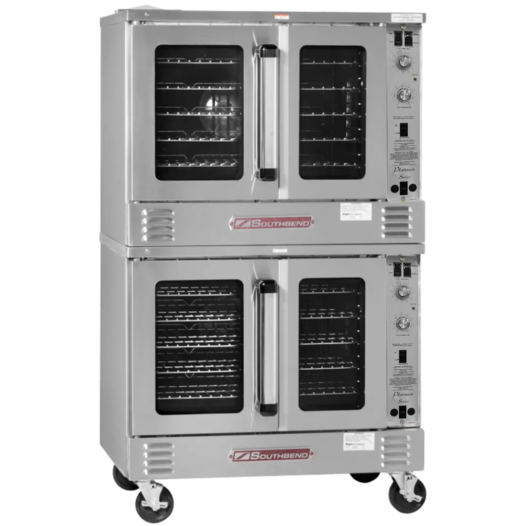 This Platinum Series Convection Oven is a gas (Natural Gas), double deck, bakery cavity depth, 180,000 BTU of power, with standard controls and independent doors. This series features a stainless steel exterior. Standard Depth ovens and accommodate one full size (18" x 26") sheet pan per oven rack left to right in the oven.