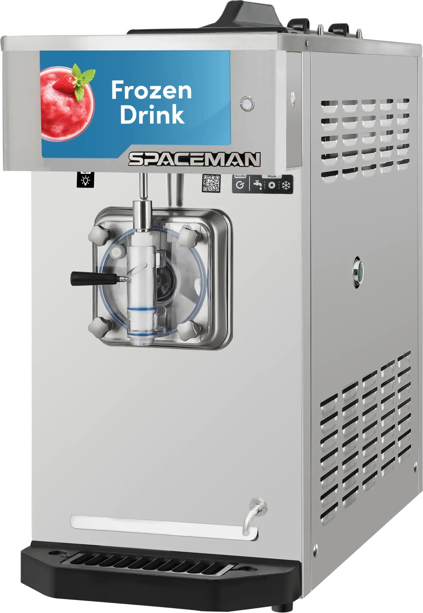The 6650-CL is a 115-volt countertop single flavor frozen beverage machine designed to outperform any competitor in freeze time, recovery time, and servings per hour. With Spaceman’s patented freezing technology, it achieves rapid freeze-down and recovery, efficient cooling, and lower energy consumption per serving. Pre-cooling in the hopper refrigerates product before it enters the freezing cylinder, further reducing freeze times while ensuring food safety approval for storing product overnight, including dairy-based mixes. The 6650-CL features a 7.3-quart freezing cylinder and a 16-quart hopper, producing up to 210 (8oz) servings per hour, or 4 servings per minute, with a maximum suggested serving size of 32oz. At the core of its performance is Spaceman’s patented 100% Controlled Contact Flooded Evaporator, engineered for maximum efficiency and delivering the fastest freeze-down and recovery times in the industry. This innovation produces smaller ice crystals for the smoothest, creamiest mouthfeel. Continuous improvements in design, guided by field feedback and R&D, enhance structural integrity, reduce failures, and improve long-term serviceability. The single-piece V3 auger combines the drive shaft and auger into one solid over-molded plastic and steel assembly. This design reduces parts, cuts cleaning time, and enhances drink quality by precisely scraping the cylinder walls and controlling product flow for smaller ice crystals and smoother consistency. The overhead design also allows operators to switch products and hardness levels in under 30 seconds. Multi-unit operators can standardize performance easily with a simple 1–6 consistency setting across locations, while the low evaporator temperature gives the 6650-CL the ability to freeze alcoholic beverages with ease. Operator-friendly enhancements include an RGB display with a low-level indicator that flashes red when product is running low, and a low-mix freeze protection system that prevents freeze-ups by automatically switching to standby mode when mix runs out. Backlit virtual merchandising provides a high-visibility illuminated display area for branding and marketing, complete with flavor cards and custom design options. Compact, efficient, and high-performing, the Spaceman 6650-CL is the perfect addition to nightclubs, bars, hotels, pool bars, restaurants, breweries, or mobile and food trucks—delivering consistently smooth, icy-cold products that elevate any menu.