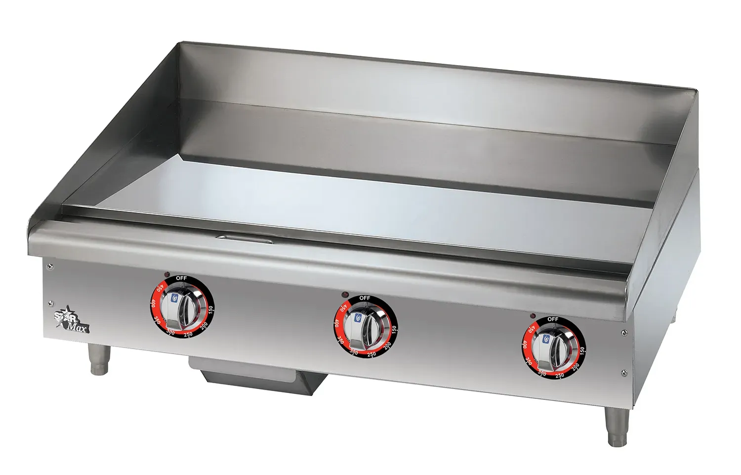 TEST IN PIM Star-Max® electric griddles provide precise temperature control and are a perfect addition to any food service operation. Electric griddles are constructed with quality and durability in mind. Polished steel or chrome plate options available. Available in 15”, 24”, 36” and 48” widths. Snap-action thermostat adjusts from 150° to 450°F.