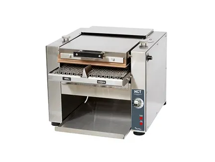The HCT13M contact toaster seals bread surfaces which provides a crispy texture and keeps sauces from penetrating the bun. The HCT13M features analog controls and a metal chain belt.